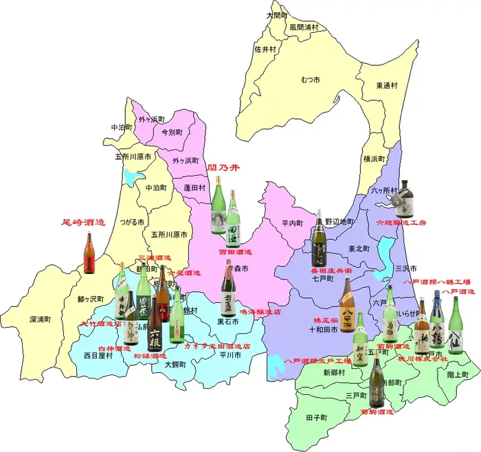 八戶酒造(陸奧八仙)、八戶酒類八鶴工廠(八鶴)、八戶酒類五戶工廠(如空)、桃川酒造(桃川)、盛田莊兵衛(駒泉)、鳩正宗(鳩正宗)、六趣釀造工房(六趣)、西田酒造(田酒)、關乃井(關乃井)、鳴海釀造店(菊乃井)